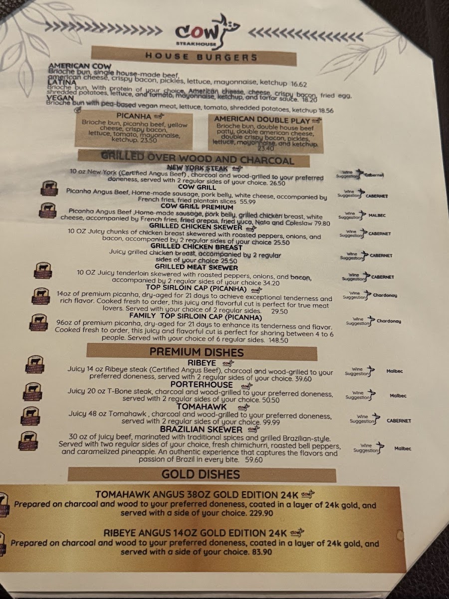 Prepared on charcoal and wood to your preferred doneness, coated in a layer of 24k gold, and served with a side of your choice.